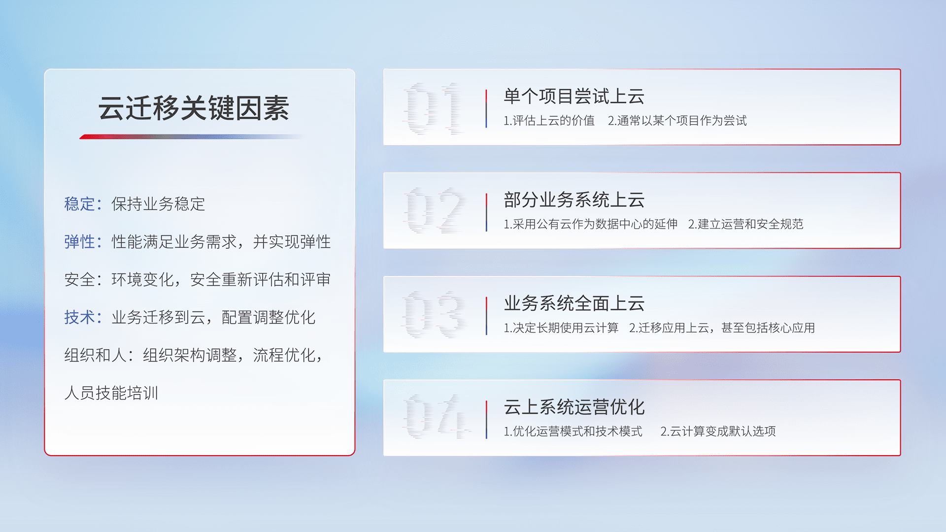 结合实际业务,,,从规划设计、、云平台选型、、云原生改造、、数据迁移、、、、集成交付,,,,迁移全过程为客户识别最佳上云路径,,,,做好风险识别管理,,,设计网络架构、、、、身份权限、、安全审计合规、、、操作审计、、、、日志审计、、监控告警策略、、、、多站点容灾设计等,,,,对云上基础设施进行整体规划,,提升IT治理水平,,以满足弹性、、、、高可用、、、高性能的需求。。